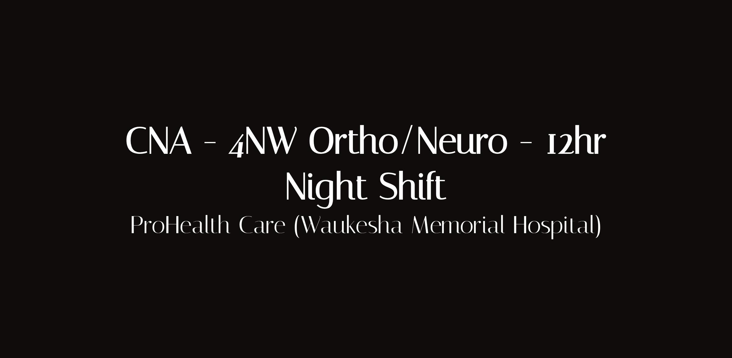 CNA — 4NW Ortho/Neuro — 12-Hour Night ShiftLocation: Waukesha Memorial Hospital, Waukesha, WIShift: Nights — 3rd Shift, 7:00 PM – 7:30 AM, every other weekendPay: Starting from $18.00/hour + night shift differentialWork on the Ortho/Neuro unit at one of Southeastern Wisconsin's top hospitals. This unit cares for patients recovering from orthopedic and neurological procedures.Responsibilities:Assist orthopedic and neuroscience patients with mobility and ADLsMonitor patient condition and report ch