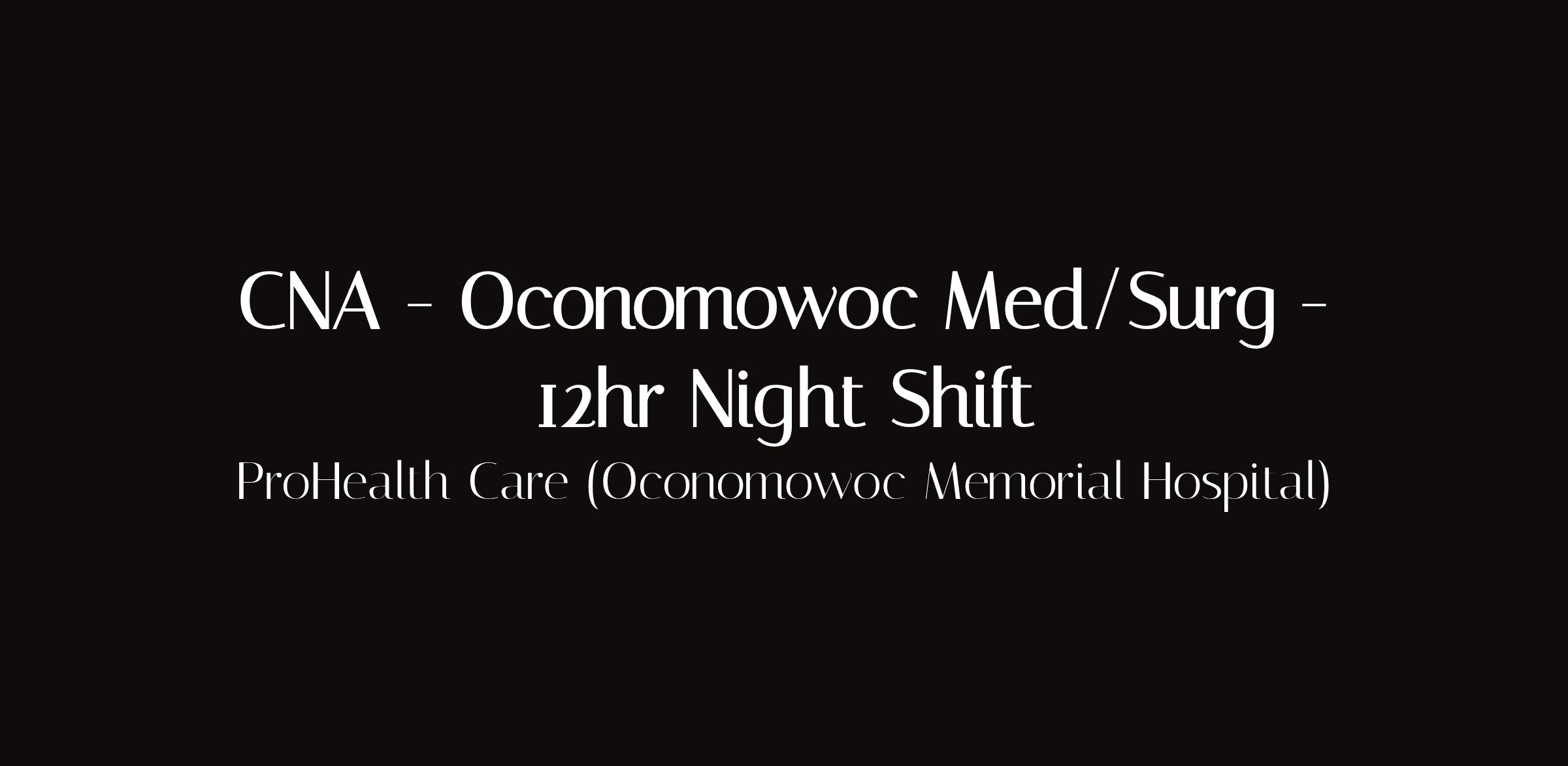 CNA — Oconomowoc Med/Surg — 12-Hour Night ShiftLocation: Oconomowoc Memorial Hospital, Oconomowoc, WIShift: Nights — 3rd Shift, 7:00 PM – 7:30 AM, every other weekendPay: Starting from $18.00/hour + night shift differentialSchedule: 0.9 FTE (36 hours/week)Join the Med/Surg team at Oconomowoc Memorial Hospital. This unit provides comprehensive care for adult patients with a wide range of medical and surgical conditions.Responsibilities:Provide direct patient care under the supervision of RNsAssis