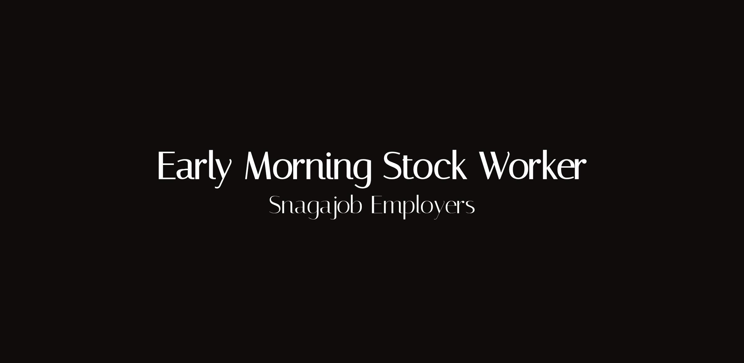 Early Morning Stock WorkerLocation: Milwaukee, WIType: Early morning hourlyVolume: 158 early morning stock rolesEarly morning stock positions in Milwaukee via Snagajob. Retail restocking, inventory receiving, and merchandise preparation during early morning hours before store opening.