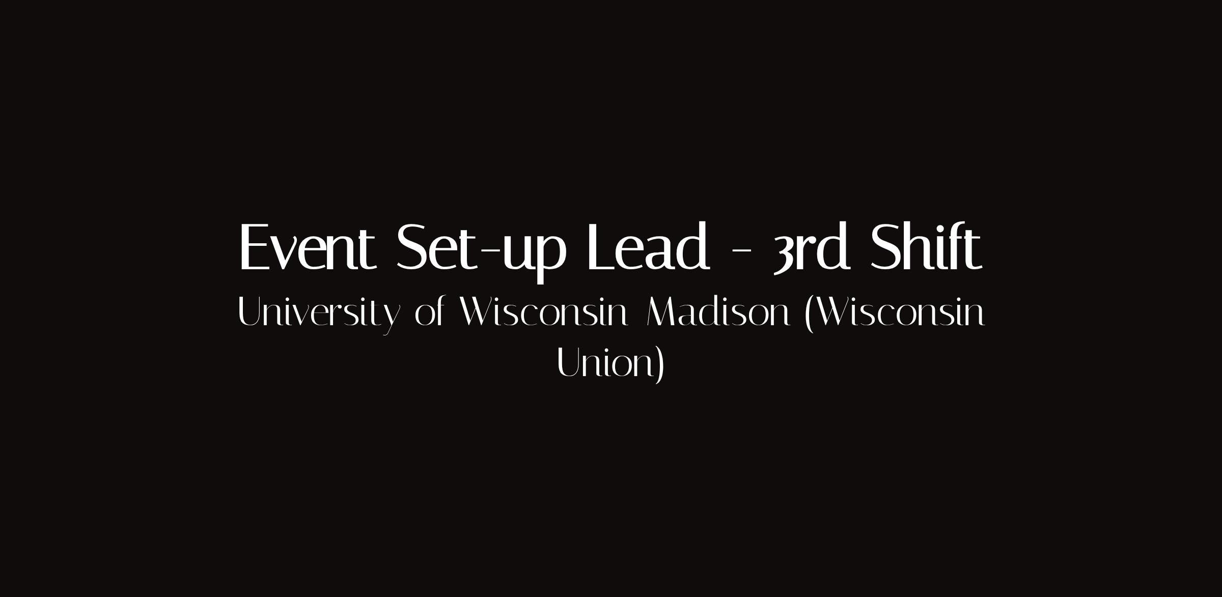 Event Set-up Lead — 3rd ShiftLocation: Union South, Madison, WIShift: Tuesday–Saturday 10:45 PM – 7:15 AMPay: $18.00/hour + $2.50 night differential + $0.80 weekend differentialThis frontline position coordinates and executes event setups for conferences, meetings, and special events at Union South. The Event Setup Lead will guide and train student workers and ensure smooth execution of events.Responsibilities:Perform on-site event set-up and clean-upGuide and train student workers on proper pro