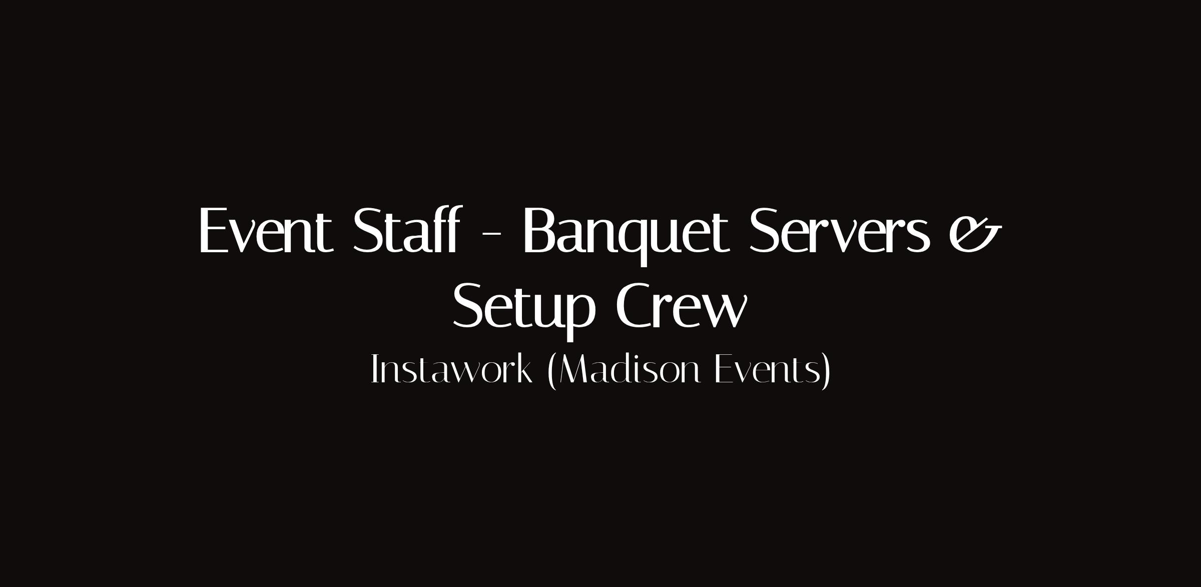 Event Staff — Banquet Servers & Setup CrewLocation: Madison, WI (Union South, Monona Terrace, and area venues)Shift: Varies by event — days, evenings, weekends availablePay: $16.00 – $22.00/hour (varies by role and event)Instawork is staffing events across Madison including conferences at Union South, galas at Monona Terrace, weddings, corporate events, festivals, and sports events. Pick up shifts that fit your schedule.Available Roles:Banquet Servers — plated dinner service, wine pouringSet