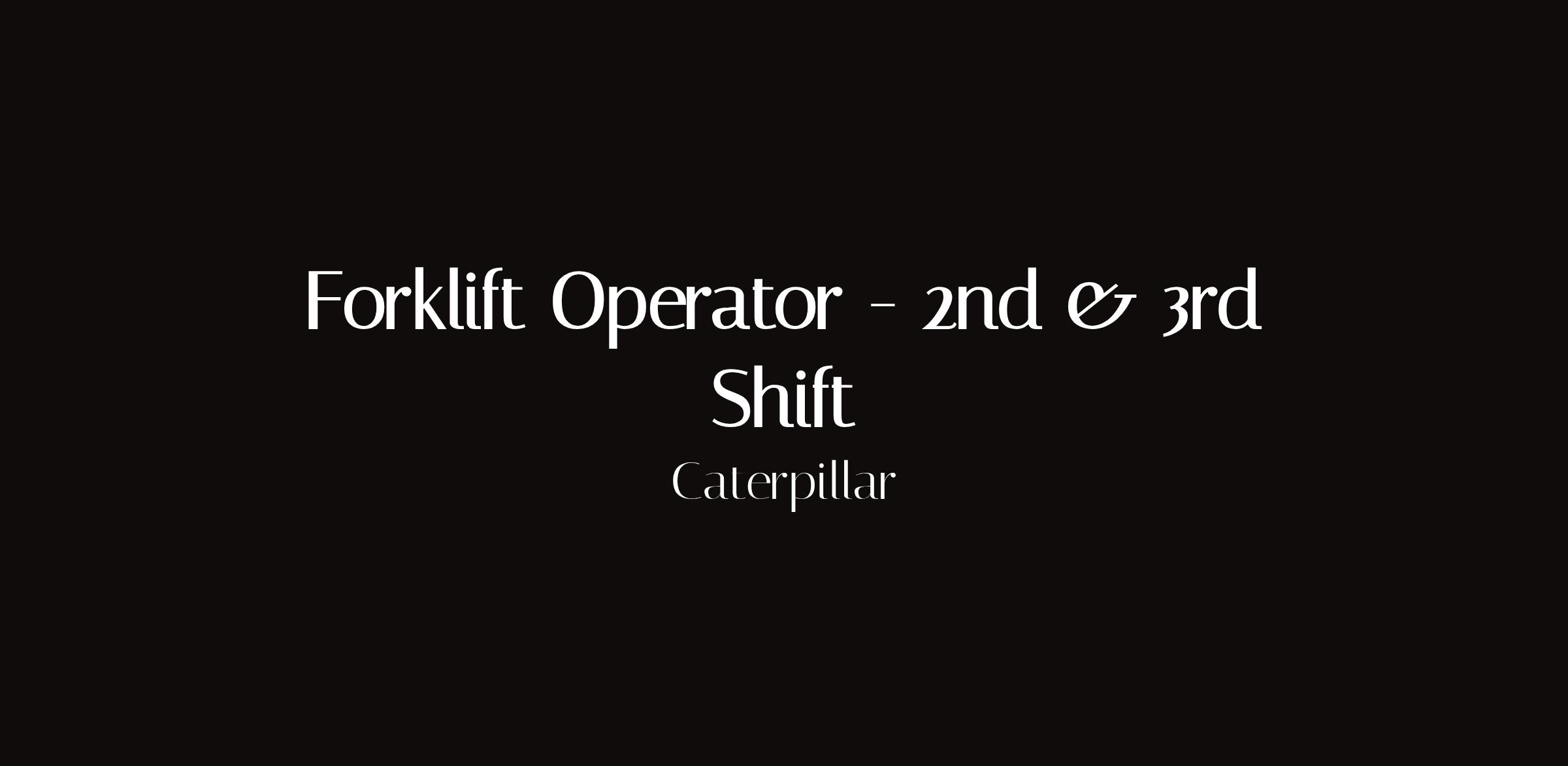 Forklift Operator - 2nd & 3rd ShiftLocation: Morton ILShifts: 2nd and 3rd Shift | Pay: $19.91/hourCaterpillar is hiring Forklift Operators for 2nd and 3rd shift at our Morton facility. Join the world's leading manufacturer of construction and mining equipment.Responsibilities:Operate forklifts to move materials throughout the facilityLoad and unload trucks and rail carsPerform pre-shift equipment inspectionsMaintain accurate inventory recordsBenefits: Comprehensive health insurance 401(k) wi