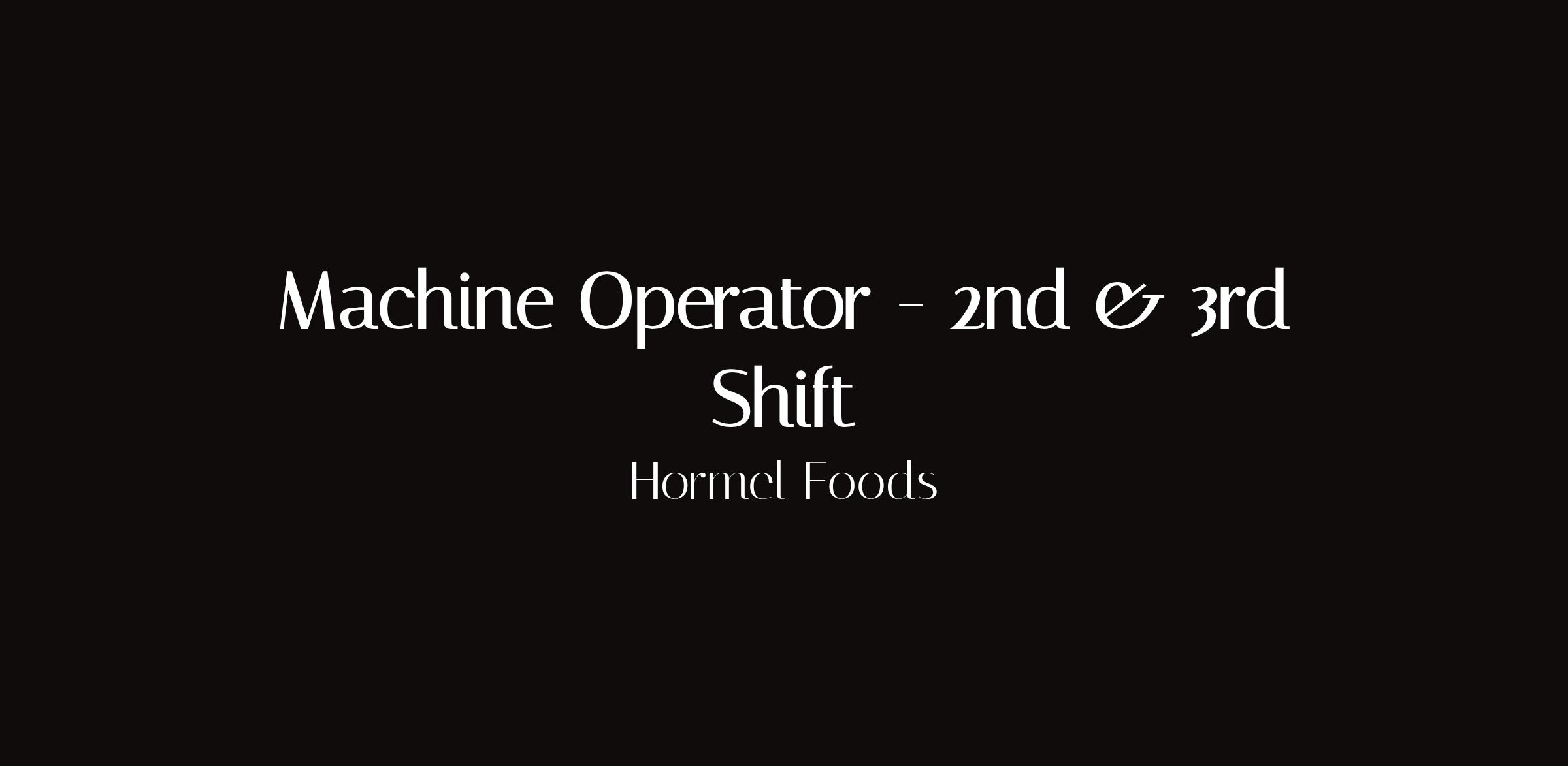 Machine Operator — 2nd & 3rd ShiftLocation: Beloit, WIShifts: 2nd Shift 2:00 PM – 10:00 PM | 3rd Shift 10:00 PM – 6:00 AMPay: $20.00/hour + $2.00 shift differential for 3rd shiftHormel Foods is hiring Machine Operators for our Beloit food processing facility. Join a leading food company with stable hours and growth opportunities.Responsibilities:Operate automated food packaging and processing equipmentMonitor product quality and machine performancePerform changeovers between product SKUsComp