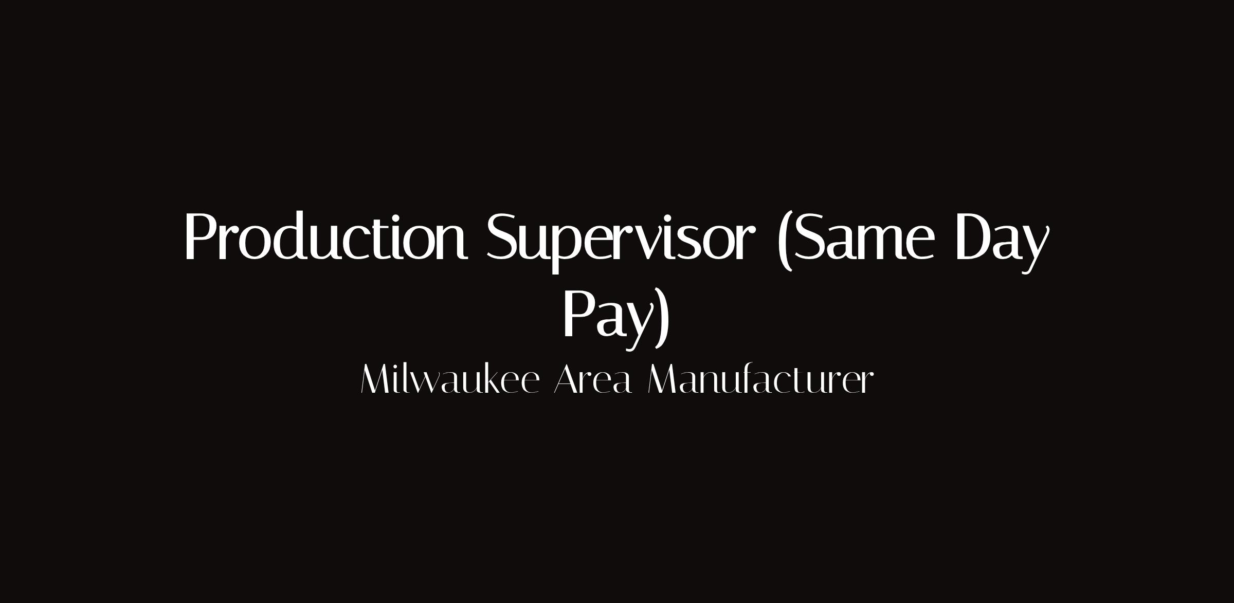 Production Supervisor — Same Day PayLocation: Milwaukee, WI areaType: Same day payProduction supervisor position with same-day pay available in Milwaukee. Manufacturing floor supervision, quality oversight, and team coordination.