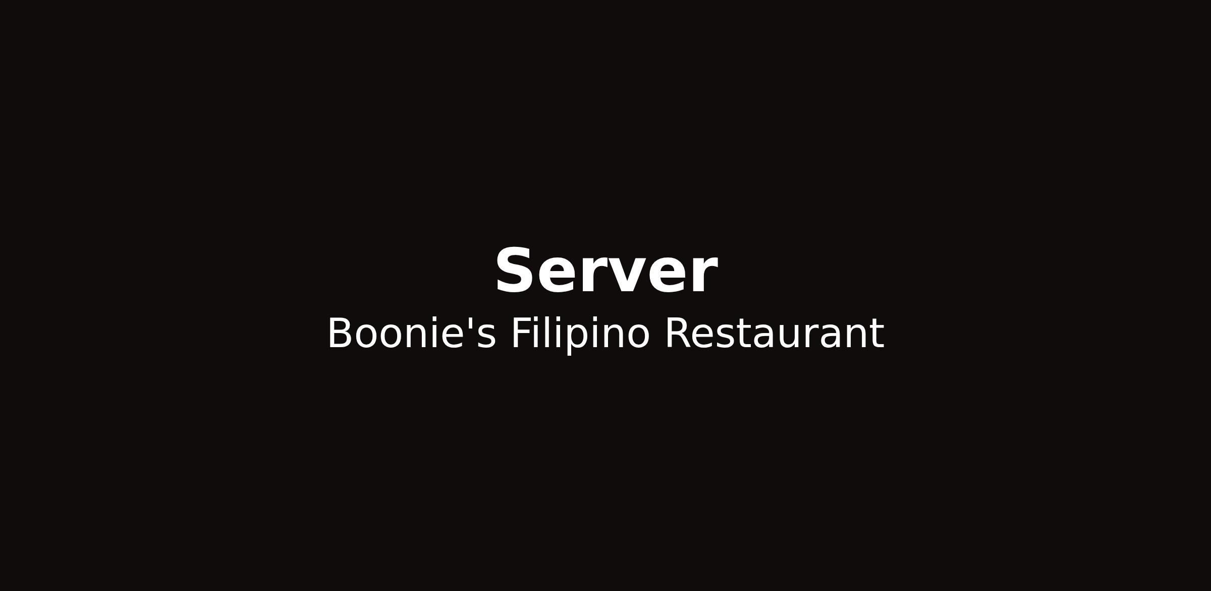 ServerLocation: Chicago, ILType: Restaurant staffingPay: ~$12.62/hour + tipsServer at Boonie's Filipino Restaurant in Chicago. Filipino cuisine knowledge, friendly service, and family-style dining experience.