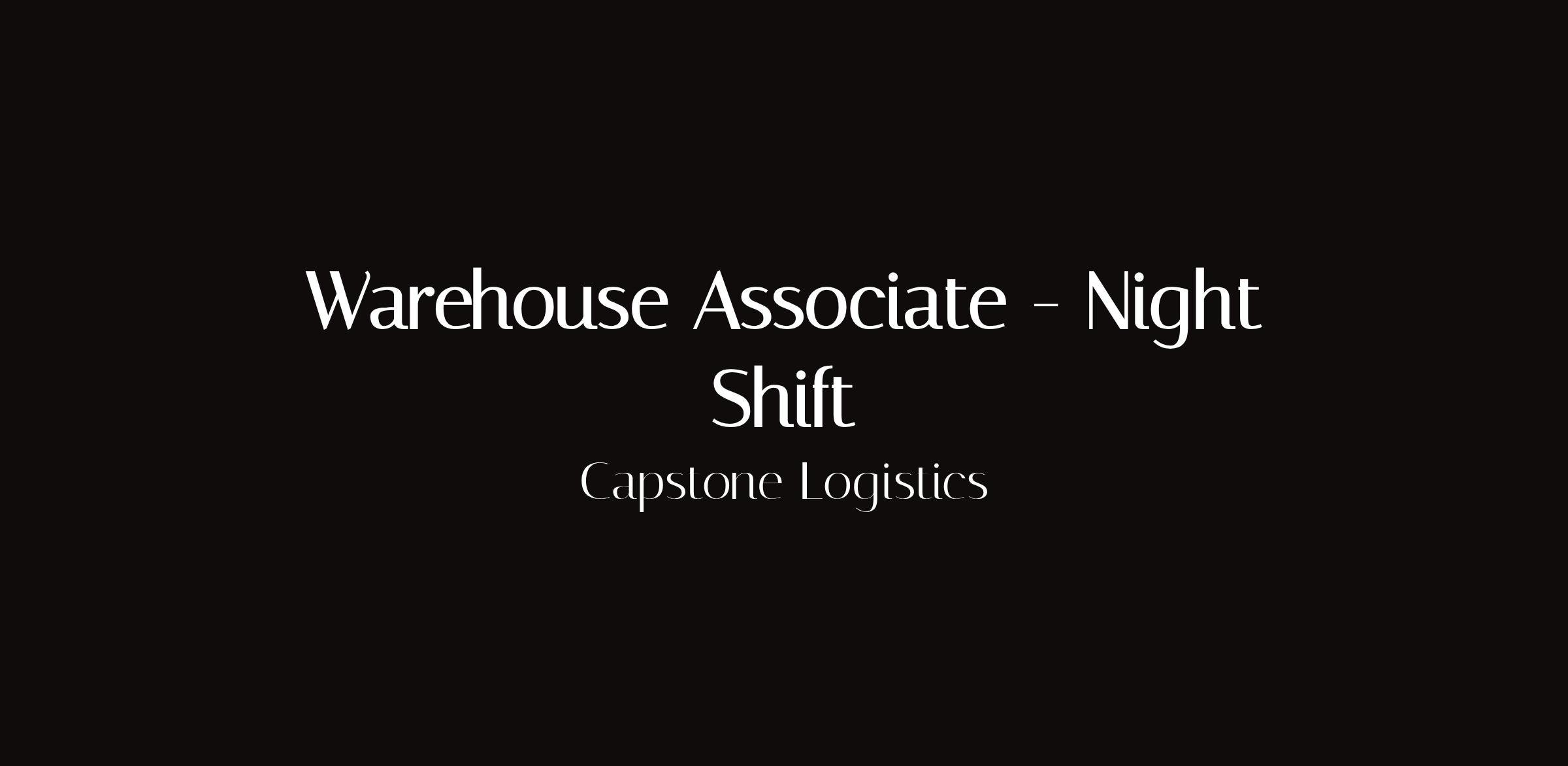 Warehouse Associate - Night ShiftLocation: Oconomowoc WIShift: Schedule set at hire: 6:00PM-Finish / 8:00PM-Finish / 10:00PM-FinishPay: $600-$1200/weeklyCapstone is hiring night shift warehouse associates in Oconomowoc. Multiple start times available with excellent earning potential.Responsibilities:Select and palletize grocery orders accuratelyOperate electric pallet jacks and forkliftsMeet productivity and accuracy standardsWork safely in a team environmentBenefits: Weekly pay flexible start t